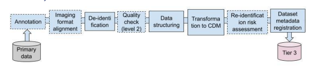 A third design issue pertains to the mechanisms through which the data stations are to be populated with data by the data holder. In essence the industry is converging towards solution patterns from data engineering and data warehousing where the data station is realized using the lakehouse architecture (see [30] and references therein). We stress the importance to difference between OLTP and OLAP systems where we envisage a data station for secondary use as an OLAP system. To illustrate this difference, consider the OpenHIE specification where the Shared Health Record is positioned as the data station for OLTP and the analytics datawarehouse as a separate OLAP functional building block that is populated using FHIR data pipelines [30, 31]. Figure 1 shows an example of such a setup, in this case for the imaging domain. The Extract-Transform-Load pattern of this pipeline includes various data (pre-)processing steps including image format alignment, de-identification and transformation to a common data model (CDM).