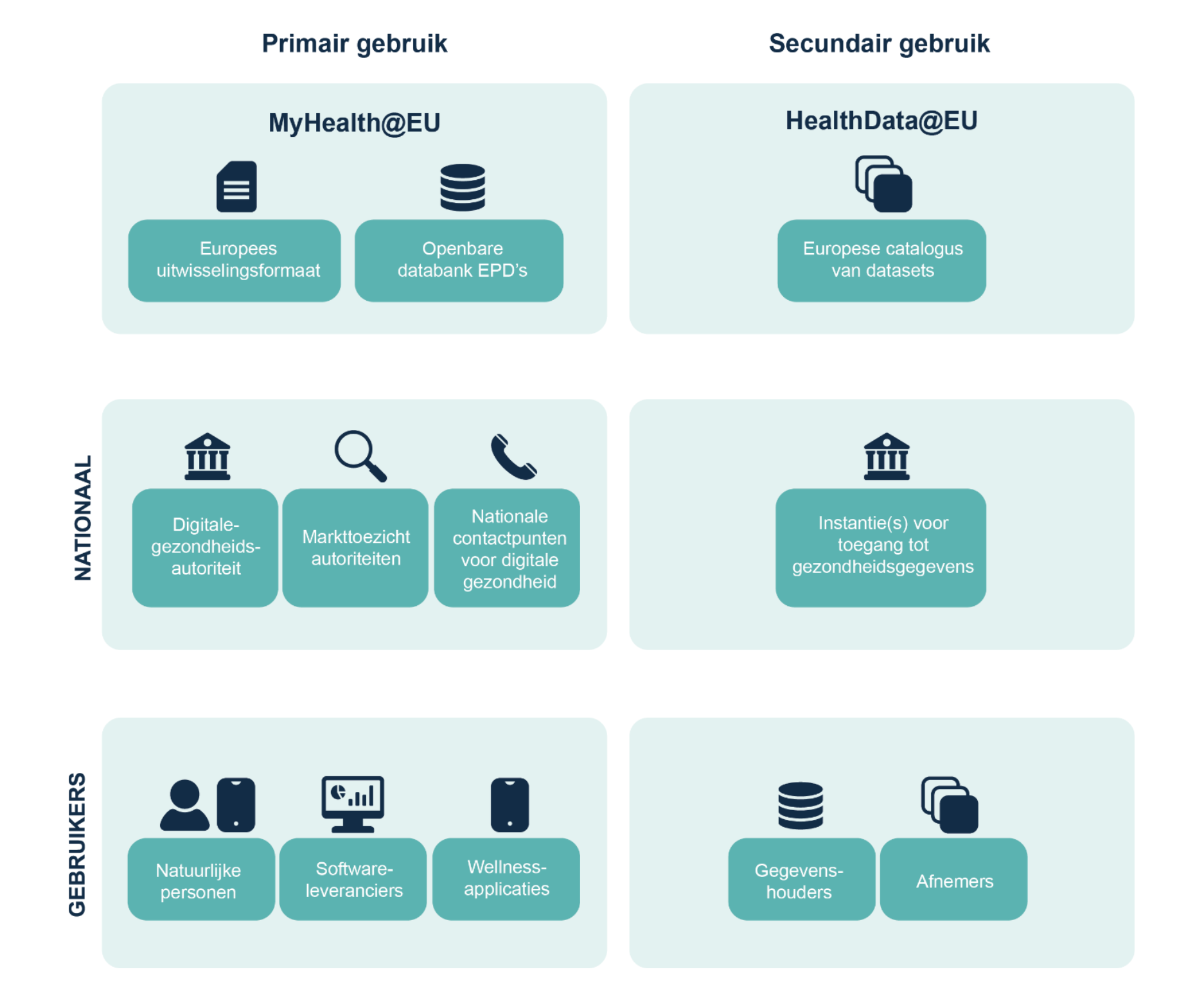 - maart 2027: vaststelling landelijke uitvoeringswetten met gedetailleerde regels en praktische uitwerking van de verordening, inclusief de benoeming van de nationale Health Data Access Body (HDAB) als orgaan voor toezicht op en mogelijk maken van secundair gebruik.