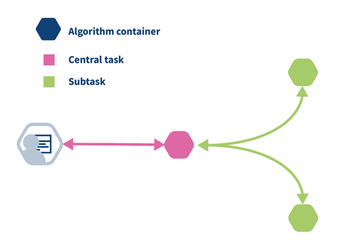 De meest simpele taakverdeling in vantage6 is als volgt. De datagebruiker (links) creëert een taak voor het centrale deel van het algoritme (roze zeshoek). Het centrale deel creëert sub-taken voor de gefedereerde delen (groene zeshoeken). Wanneer de sub-taken zijn voltooid, verzamelt het centrale deel de resultaten en berekent het het uiteindelijke resultaat, dat vervolgens beschikbaar is voor de datagebruiker.