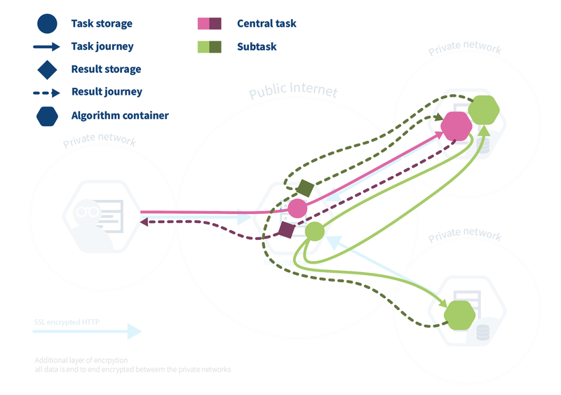 De datastations ontvangen hun subtaak van de centrale server, downloaden hetzelfde Docker-image en starten het lokale deel van het algoritme. De analyse wordt uitgevoerd op de lokale data.