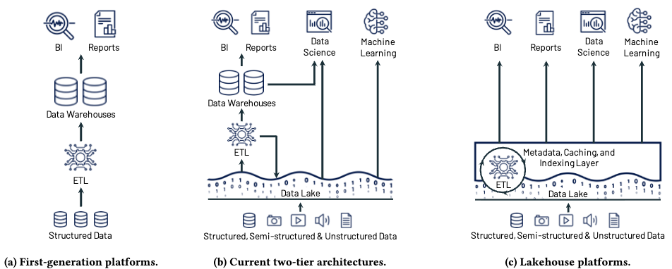 Sinds de komst van relationele databases zijn grofweg drie generaties van data infrastructuren te onderscheiden: datawarehouses, data lakes en de lakehouse architectuur.